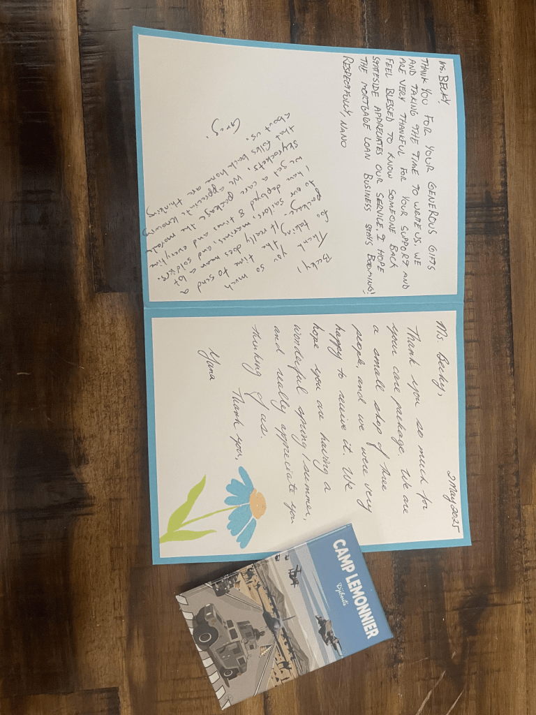This is a card from Yana, Nano, and Greg for thanking Operation American Soldier for delivering their packages. The letter is shown below: